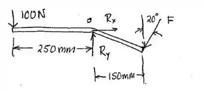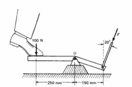 Uma força de 100 N é necessária para operar o pedal conforme mostrado. Determine a força no elo de ligação e a força exercida pela alavanca sobre o mancal em O. Despreze o peso da alavanca.