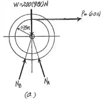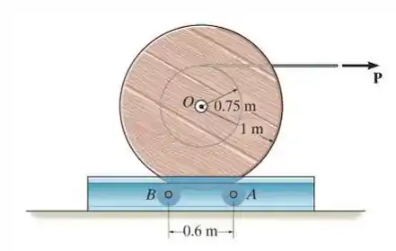 Uma força de P=60N é aplicada ao cabo, o que faz com que o carretel de 200 kg gire, pois está apoiado nos dois roletes A e B do dispensador. Determine a velocidade angular do carretel após ele ter dado duas voltas partindo do repouso. Despreze a massa dos roletes e a massa do cabo. Suponha que o raio de giro do carretel em torno de seu eixo central permaneça constante em