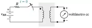 que o terminal ligado ao terminal positivo da bateria receba a marcação de polaridade como mostra a figura. Quando o interruptor está aberto, o voltímetro cc sofre uma deflexão negativa. Em que lugar do enrolamento ligado ao voltímetro cc sofre uma deflexão negativa. Em que lugar do enrolamento ligado ao voltímetro deve ser colocada a marcação de polaridade?