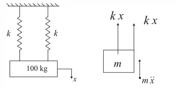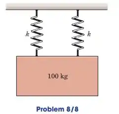 Se a massa de 100 kg tem uma velocidade para baixo de ao passar pela sua posição de equilíbrio, calcule a magnitude de sua aceleração máxima. Cada uma das duas molas tem uma rigidez .