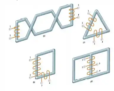 A montagem física de quatro pares de enrolamentos acoplados magneticamente é mostrada