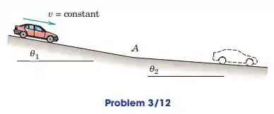 Um motorista descobre que seu carro vai descer a ladeira a uma certa velocidade constante sem freios ou acelerador necessário. A inclinação diminui bastante abruptamente para o ponto A. Se o motorista não fizer nada, mas continuar a desacelerar, determine a aceleração a do carro logo após ele passar pelo ponto A para o condições (a) e (b).
