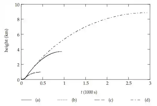 Podemos integrar numericamente para obter a segunda parte da jornada, ou usar os resultados do Problema 9-63(b) para nos ajudar a obter a distância adicional percorrida com a resistência do ar, analiticamente. A altura total até a qual o foguete sobe é de 890 km em um tempo total de vôo de 410 s.