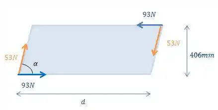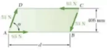 Uma placa em forma de paralelogramo sofre a ação de dois binários. Determine o momento do binário formado pelas duas forças de 93 N, a distância perpendicular entre as forças de 53 N fazendo com que o momento resultante seja zero, e o valor de para quando d = 1,06 m e M = 8,1 N.m.