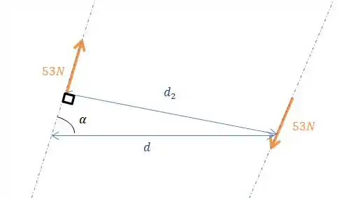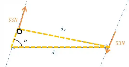 Agora é preciso tomar cuidado aqui hein!! Essa distância é a distância perpendicular entre as forças de e que como essas forças estão inclinadas, essa não é a distância do nosso desenho!