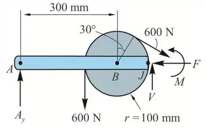 Portanto, a força cortante em J na barra ABJ é .