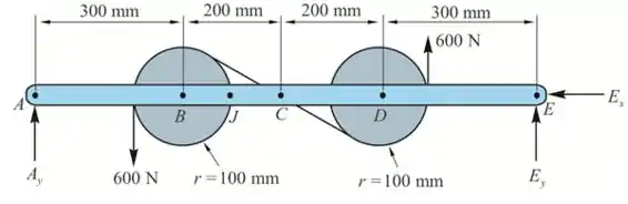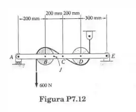 Sabendo que cada roldana tem um raio de 100 mm, determine as forças internas nos pontos : (a) C e (b) J.
