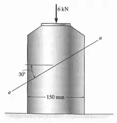 A sapata de apoio consiste em um bloco de alumínio de por que suporta uma carga de compressão de . Determine a tensão normal média e a tensão de cisalhamento média que agem no plano que passa pela seção . Mostre os resultados em um elemento de volume infinitesimal localizado no plano.