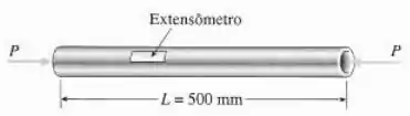 Um tubo circular de alumínio de comprimento é carregado em compressão por forças (veja a figura). Os diâmetros externo e interno têm e , respectivamente. Um medidor de deformação é colocado na superfície externa da barra para medir deformações normais na direção longitudinal.