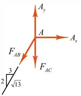 Vamos aplicar o equilíbrio de forças ao longo da direção vertical para encontrar a componente vertical da força de reação no suporte do pino A;