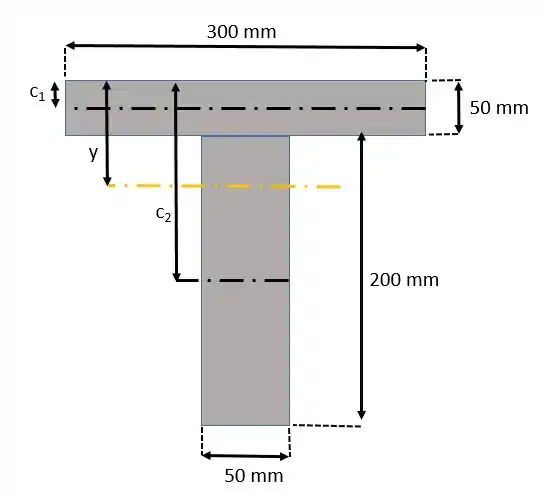 Aqui representa a altura da linha neutra (laranja), enquanto e representam os centroides de cada elemento, valendo, respectivamente, e . Assim, a linha neutra é calculada como: