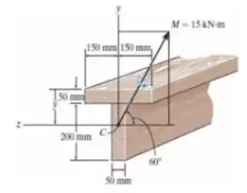 Oi oi, meu xuxuzinho!! Tudo bem com você?? Vamos analisar o que a nossa questão nos pede e matar essa em 10 minutos?? Bora!! Bom, nosso enunciado nos diz que essa viga tem um formato de T e um momento aplicado a 60° do eixo horizontal, e nos pede a tensão de flexão máxima e a orientação do eixo neutro.