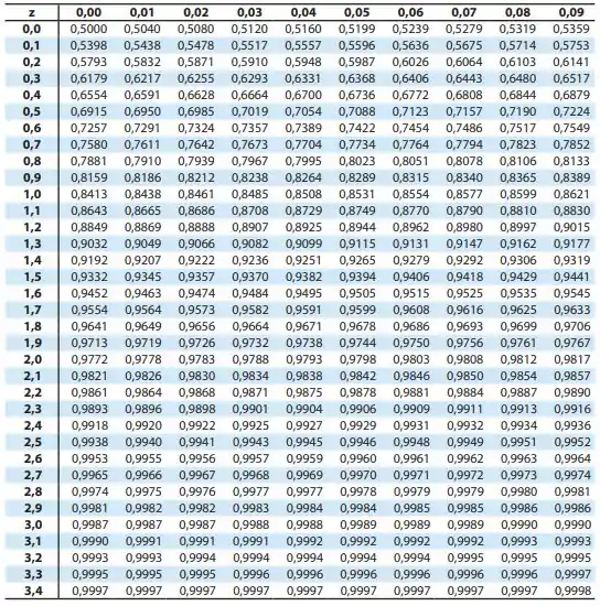 Primeiramente, precisamos ter em mente que o escore-z a ser determinado corresponde à uma área de . Vamos conferir na tabela: