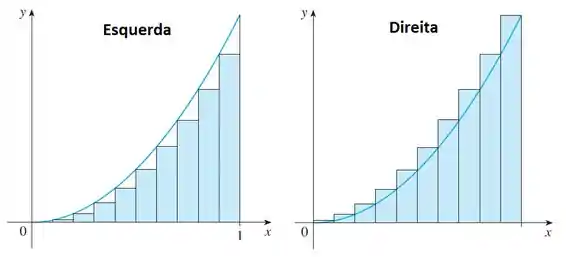 Basicamente, nós podemos estimar a área embaixo de uma curva usando retângulos ajustados à esquerda ou a direita na função. Olha aqui um exemplo: