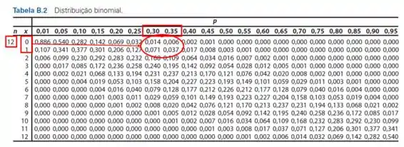 Iremos utilizar a Tabela de Distribuição binomial, da seguinte maneira: