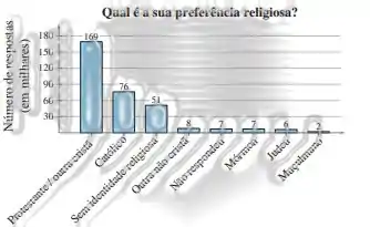 Nos exercícios 37 a 40, use o gráfico de Pareto a seguir, que mostra o resultado de uma pesquisa na qual 326.000 adultos foram indagados sobre com qual religião eles se identificam. (Adaptado de: Gallup.)
