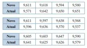 Um técnico de qualidade afirma que a variância dos diâmetros de inserção produzidos pelo novo molde de injeção para inserção de painel de automóvel é menor que a variância dos diâmetros de inserção produzidos pelo molde atual. A tabela a seguir apresenta amostras de diâmetros de inserção (em centímetros) para os moldes novo e atual. Com a = 0,05, você pode concordar com a afirmação do técnico?