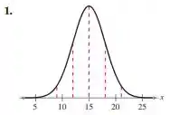 O desvio padrão pode ser encontrado usando os pontos de inflexão, porque os pontos de inflexão são um desvio padrão da média. Os pontos de inflexão estão nas linhas verticais vizinhas a linha central no gráfico dado, que notamos estão aproximadamente em 12 e 18.