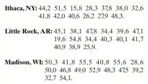 Para os exercícios 3 e 4, use os dados a seguir, que listam os salários anuais (em milhares de dólares) de indivíduos selecionados aleatoriamente de três regiões metropolitanas. Suponha que os salários são normalmente distribuídos e que as amostras são independentes. (Adaptado de: U.S. Bureau of Economic Analysis.)