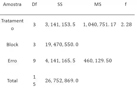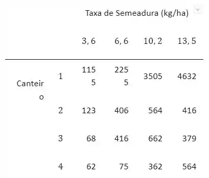 Havia quatro canteiros disponíveis para um experimento de comparação da quantidade de trevos para quatro diferentes taxas de semeadura ("Performance of Overdrilled Red Clover with Different Sowing Rates and Initial Grazing Managements", N. Zeal. J. Exp. Ag., 1984 , p. 71-81). Visto que os canteiros foram adubados diferentemente antes do experimento e que se avaliou que isso poderia influenciar na quantidade de trevos, foi usado um experimento em bloco aleatorizado, e todas as quatro taxas de semeadura foram experimentadas em uma parte de cada canteiro. Use os dados fornecidos para testar a hipótese nula de que não existe nenhuma diferença na média real da acumulação de trevos para as diferentes taxas de semeadura.