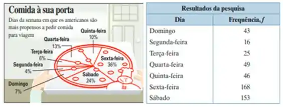 9. Pedido para viagem Uma empresa de pesquisa afirma que a distribuição dos dias da semana em que as pessoas são mais propensas a pedir comida para viagem é diferente da distribuição mostrada na figura a seguir. Você seleciona aleatoriamente 500 pessoas e registra em qual dia da semana cada uma é mais propensa a pedir comida para viagem. A tabela a seguir mostra os resultados. Para a = 0,01, teste a afirmação da empresa de pesquisa. (Fonte: Technomic, Inc.).