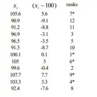 Testamos vs. .. A estatística de teste é s_+=soma dos ranks associados aos valores positivos de e rejeitamos no nível de significância 0,05 se s_+≥64. (da Tabela A.13, n=12, com α/2=.026, que está próximo do valor desejado de .025), ou se