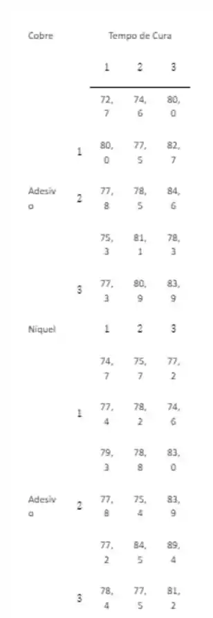 A resistência de contato na montagem de um circuito integrado em um substrato de vidro metalizado foi estudada como uma função do fator tipo de adesivo, do fator tempo de cura, e do fator material condutor (cobre e níquel). Os dados são apresentados a seguir, bem como uma tabela ANOVA do MINITAB. Que conclusões você pode tirar desses dados?