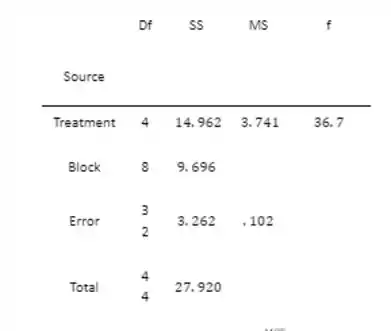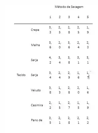 Os resultados de um estudo que verificou a eficácia da secagem no varal para a maciez do tecido foram resumidos no artigo "Line-Dried vs. Machine-Dried Fabrics: Comparison of Appearance, Hand, and Consumer Acceptance" (Home Econ. Research J., 1984, p. 27-35). A avaliação dos níveis de maciez foi feita para nove tipos diferentes de tecido e cinco diferentes métodos de secagem: (1) secagem a máquina, (2) secagem no varal, (3) secagem no varal seguida de . na secadora, (4) secagem no varal com amaciante e (5) secagem no varal com ventilação. Considerando os diferentes tipos de tecido como blocos, construa uma tabela ANOVA. Usando um nível de significância 0,05 , verifique se existe alguma diferença para a pontuação na média real da maciez dos métodos de secagem.