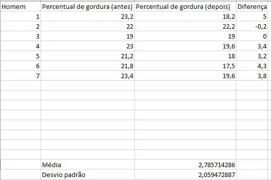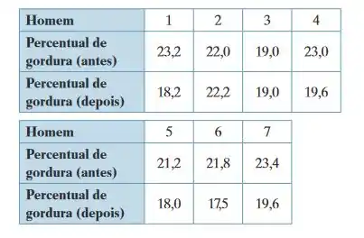 Percentual de gordura corporal - Um preparador físico afirma que treinamento de alta intensidade reduz o percentual de gordura corporal dos homens. A tabela a seguir mostra o percentual de gordura corporal de 7 homens antes e depois de 10 semanas de treinamento de alta intensidade. Para , há evidência suficiente para concordar com a afirmação do preparador físico? (Adaptado de: U.S. National Library of Medicine.)
