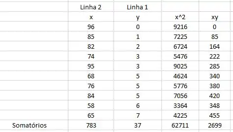 Sabendo que a quantidade de dados é n = 10, e com os valores dos somatórios obtidos, podemos substituir nas fórmulas dadas: