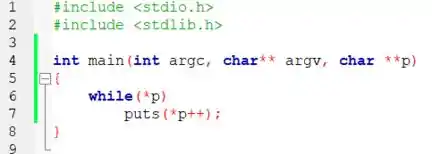 Como sugerido pelo enunciado, a estrutura do nosso terceiro parâmetro é bem semelhante à do tal argv, e ele também será um ponteiro que aponta para um ponteiro para caractere, ou seja, o declaramos assim: