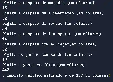 printf("O imposto FairTax estimado é de %.2lf dólares", fairtax);