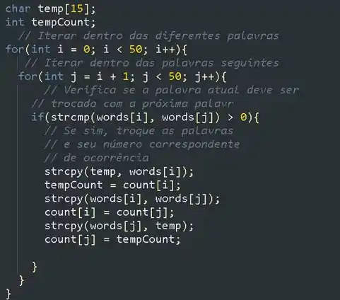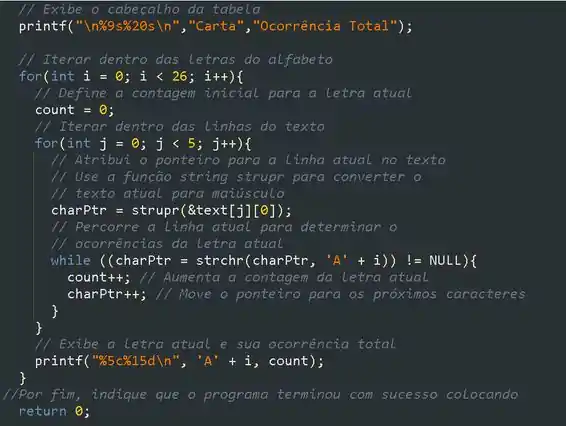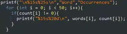 Por fim, exibiremos cada palavra diferente no texto e suas ocorrências correspondentes percorrendo a matriz de palavras e contagem. Em seguida, indicaremos que o programa foi finalizado com sucesso, colocando o valor de retorno da função principal.