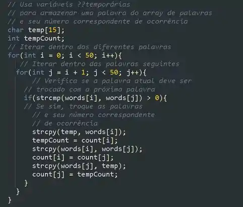 Para a versão ordenada, vamos simplesmente criar um processo para ordenar o array de palavras e inserir este processo antes de exibir o resultado. Ao ordenar o array de palavras, devemos considerar também que suas ocorrências correspondentes devem ser armazenadas em índices paralelos. Para isso, faremos o seguinte