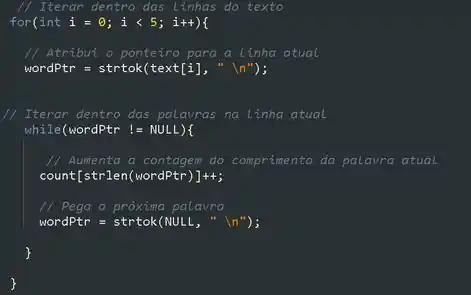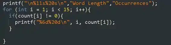 Por fim, exibiremos os comprimentos das palavras e suas ocorrências correspondentes no texto percorrendo o array e indicaremos que o programa terminou com sucesso colocando o valor de retorno da função main.
