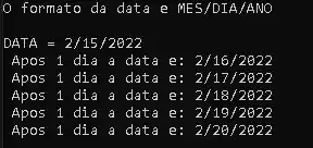 Em seguida vamos inicializar a função principal main() que receberá o objeto da classe com uma data definida em 02/15/2022 e chamar as funções. Será usado um for para incrementar os dias na data definida com a chamada da função nextDay().