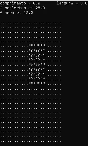 Vamos criar um programa que utiliza uma classe Rectangle que ordena as coordenadas cartesianas dos quatro cantos do retângulo. O programa irá calcular o comprimento, largura, perímetro e área do retângulo. Nosso programa também terá uma função para desenhar e mostrar o retângulo, para isso vamos usar uma função capaz de operar com os caracteres que irá exibir o desenho de um quadrado com um retângulo dentro.