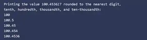 Arredondamento. Escreva um programa que imprima o valor 100.453627 arredondado até o mais próximo digito, decimo, centésimo, milésimo e decimo de milésimo.