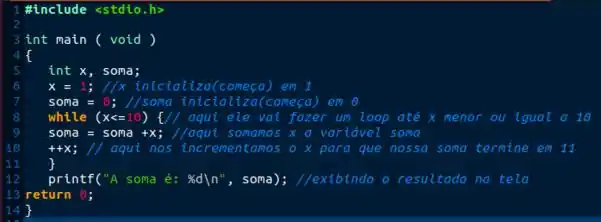 agora declare as variáveis soma e x escrevendoint x, soma; (não esqueça do “;”)