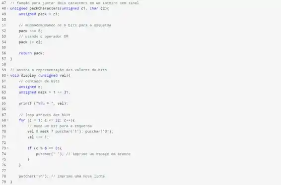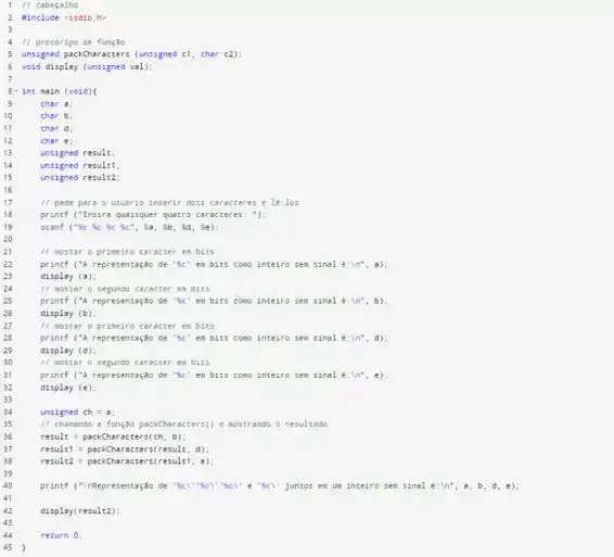 3. Chamando a função packCharacters() que empacota um unsigned int e um character em um unsigned integer.