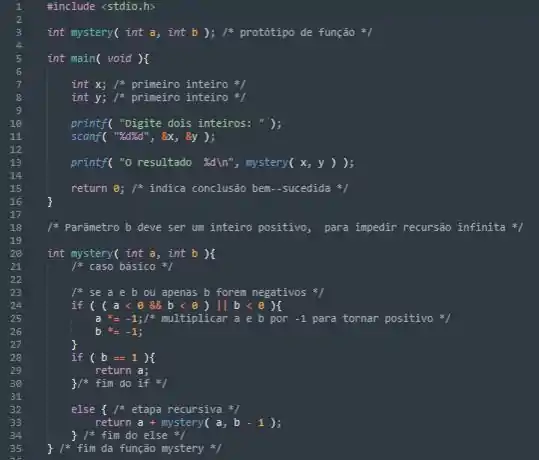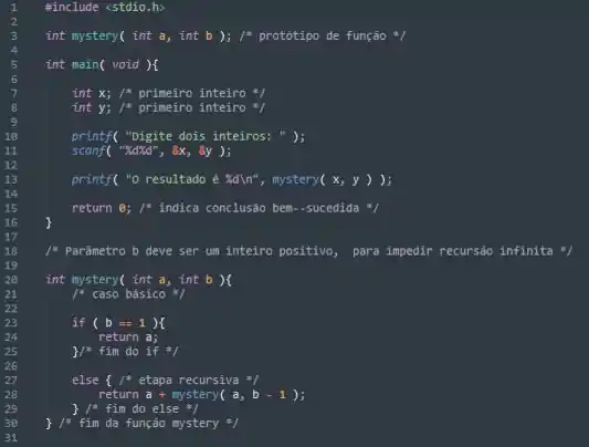 A função mystery recebe como parâmetros dois inteiros, int a e int b, em seguida tem uma condição caso o valor de b seja igual a 1, se for retornará o valor de a, caso contrário retorna uma recursão da função, retornando a + mystery (a, b -1). Podemos concluir que a função imita uma multiplicação ao somar a, b vezes.