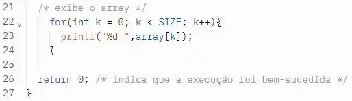 Então por fim, exibimos o nosso array ao usuário, e para isso utilizamos o laço for novamente para percorrer todo o array e imprimir seus elementos.