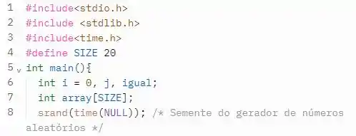 Já olhando para o main, nomeamos algumas variáveis, e inclusive o nosso array. Em seguida chamamos a função srand para gerar números distintos.