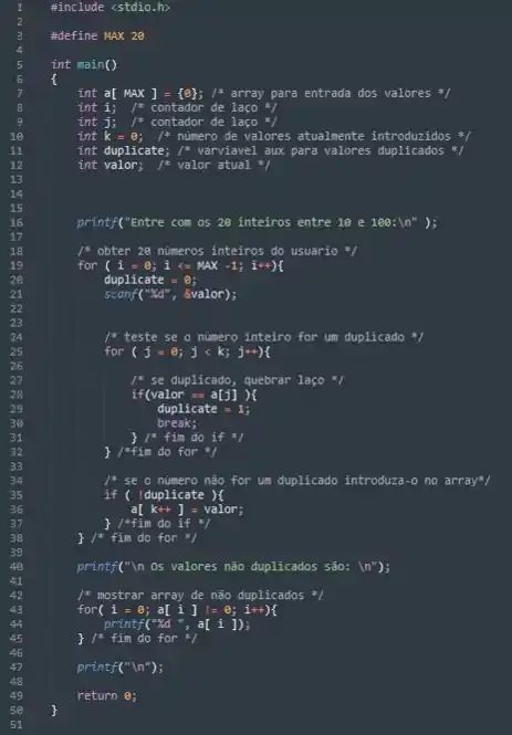 Em seguida, teremos que verificar se algum dos números inseridos pelo usuário é duplicado. Caso seja duplicado não iremos inserir ele na nossa array de resposta, que irá armazenar somente os valores não duplicados. Quando o numero não for duplicado, então ele será inserido na array. Terminado esse processo o programa irá exibir a array com todos os números não duplicados.