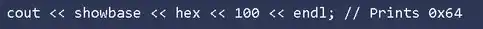 - Para imprimir o valor decimal 100 em formato hexadecimal precedido por x, usaremos a showbase dos manipuladores de stream para exibir 0x em hexadecimal para exibir o valor hexadecimal de 100.