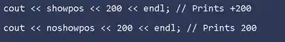 - Para imprimir 200 com e sem sinal, usaremos os manipuladores de stream showpos para exibir o sinal positivo + desse valor e o noshowpos para remover o sinal desse valor no stream de saída. Isso é