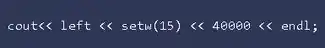 - Para imprimir o inteiro 40000 no formato justificado à esquerda e em um campo de 15 dígitos, usaremos os manipuladores de stream para a esquerda para a justificação à esquerda e setw para definir a largura do campo do fluxo de saída. Isso é