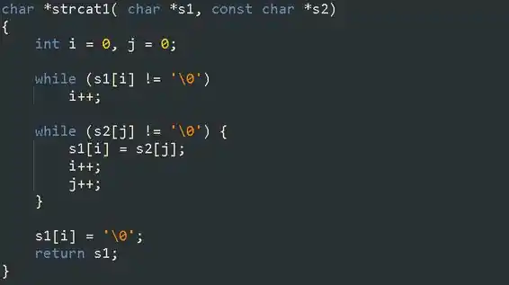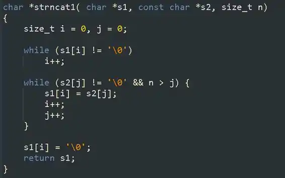 Agora, vamos precisar de duas variáveis, i e j. Usaremos i para chegar ao caractere final de s1 (na verdade, é assim que obtemos i para o índice do último caractere, para que possamos concatenar os caracteres de s2 a s1). Em seguida, usamos j para indexar os caracteres de s2 que concatenamos para s1. A única diferença entre strcat1 e strncat1 é a condição extra que temos no segundo laço while. Finalmente, definimos o último caractere de s1 para ser o caractere final de uma string.