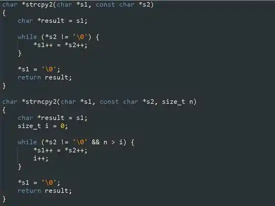 Precisaremos de outro ponteiro para s1 porque usaremos aritmética de ponteiro para s1, então acabaremos apontando para o último caractere com s1. É por isso que precisamos de outro ponteiro que aponte para o caractere inicial. Então, desreferenciamos s2 na condição do loop while. Durante o loop, continuamos atribuindo o valor desreferenciado para o qual s2 está apontando, para s1, enquanto incrementamos ambos os ponteiros no processo. Novamente, há apenas uma pequena diferença entre essas duas funções, pois continuamos fazendo a mesma coisa, com atenção ao tamanho da variável de controle em strncpy2. Finalmente, definimos o valor para o qual o ponteiro atual para s1 está apontando, para o caractere de terminação da string e retornamos o resultado que aponta para o início de s1.