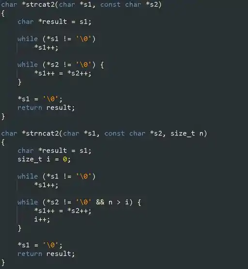 Novamente, inicializaremos o ponteiro que aponta para s1 no início de ambas as funções (porque precisaremos retornar o ponteiro que aponta para o início do array char e não poderemos usar s1 porque 'vai incrementá-lo durante o loop). Em seguida, movemos o ponteiro s1 para o caractere final no primeiro loop while e continuamos desreferenciando s2 para que possamos concatenar seus caracteres até o final de s1. Fazemos a mesma coisa para strncat2, exceto que alteramos a condição do segundo loop while. Finalmente, definimos o último caractere de s1 para o caractere de terminação da string (é claro, usando o ponteiro para ele) e retornamos o resultado mencionado acima.